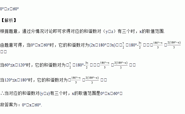 设三角形三个内角的度数分别为x,y,z,如果其中一个角的度数是另一个角的度数的2倍,那么我们称数对(y,z)(y≤z)是x的和谐数对.例:当x=150°时,对应的和谐数对有一个,它为(10,20);当x=66时,对应的和谐数对有二个,它们为(33,81),(38,76).当对应的和谐数对(y,z)有三个时,此时x的取值范围是____________.