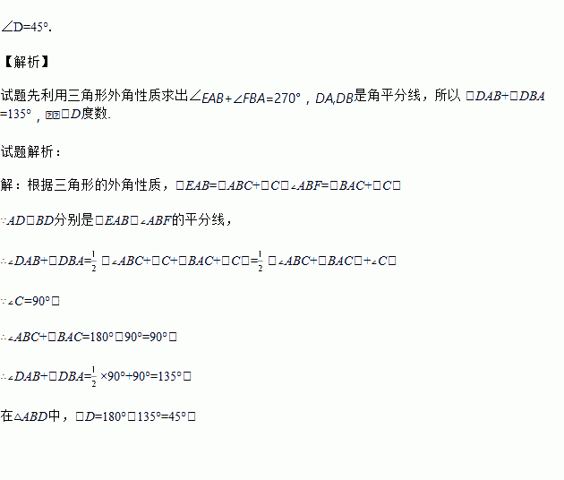 如图,在△ABC中,∠C=90°,外角∠EAB,∠ABF的平分线AD、BD相交于点D,求∠D的度数.