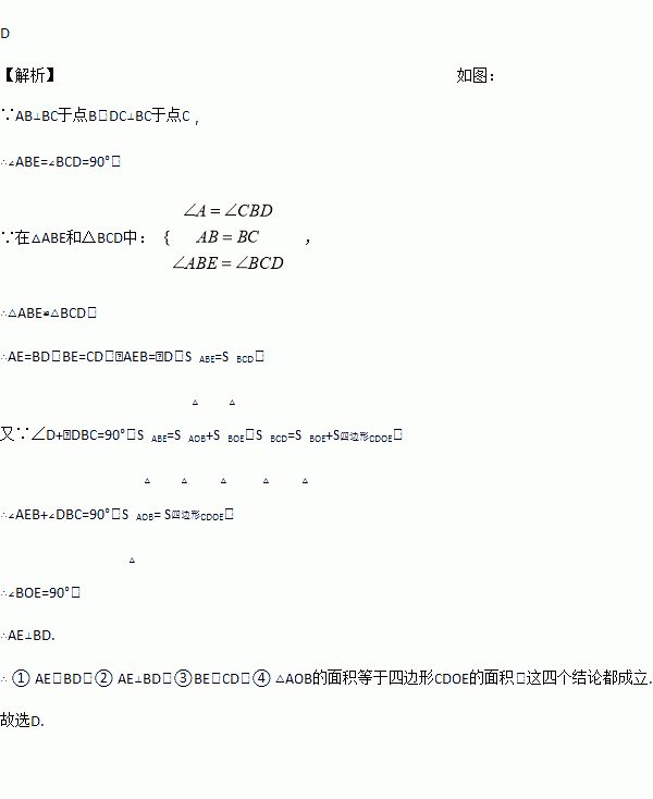 如图,E是BC边上一点,AB⊥BC于点B,DC⊥BC于点C,AB=BC,∠A=∠CBD,AE与BD交于点O,有下列结论:①AE=BD;②AE⊥BD;③BE=CD;④△AOB的面积等于四边形CDOE的面积.其中正确的结论有( )