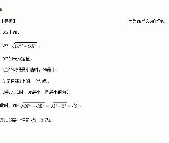 如图,⊙O的半径为2,点O到直线l的距离为3,点P是直线l上的一个动点.若PB切⊙O于点B,则PB的最小值是( )