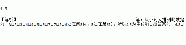 4.5 【解析】【解析】 从小到大排列此数据为:3、3、3、4、4、5、6、7、7、9.4处在第5位,5处在第6位,所以4.5为中位数.故答案为:4.5.