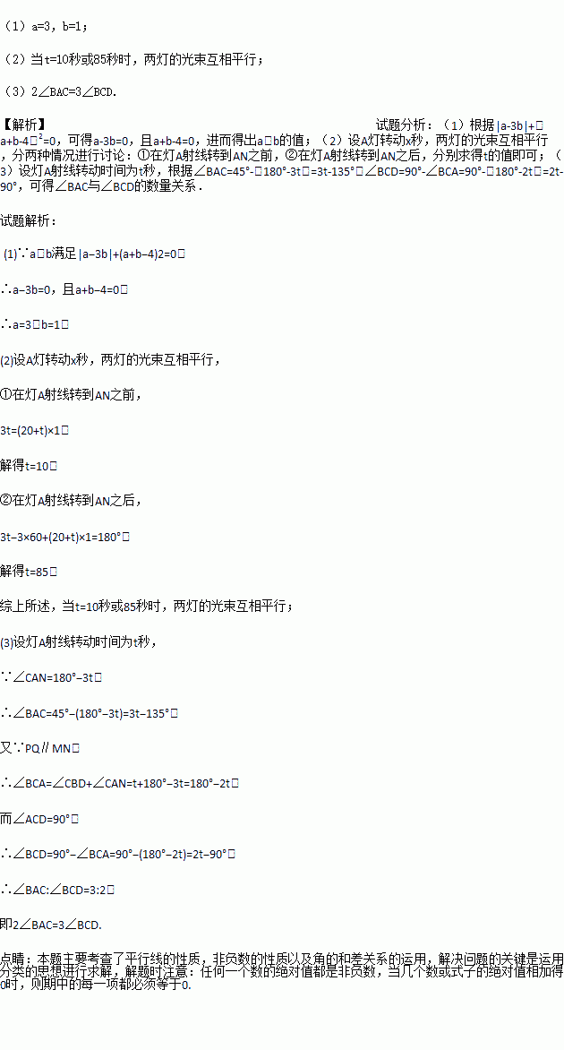 长江汛期即将来临,防汛指挥部在一危险地带两岸各安置了一探照灯,便于夜间查看江水及两岸河堤的情况.如图,灯A射线自AM顺时针旋转至AN便立即回转,灯B射线自BP顺时针旋转至BQ便立即回转,两灯不停交叉照射巡视.若灯A转动的速度是a°/秒,灯B转动的速度是b°/秒,且a、b满足|a﹣3b|+(a+b﹣4)2=0.假定这一带长江两岸河堤是平行的,即PQ∥MN,且∠BAN=45°.