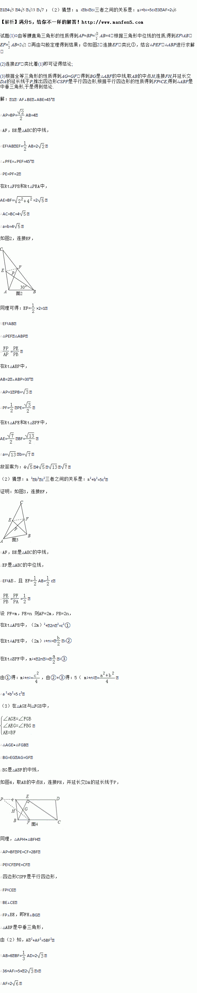 爱好思考的小茜在探究两条直线的位置关系查阅资料时,发现了“中垂三角形”,即两条中线互相垂直的三角形称为“中垂三角形”.如图(1)、图(2)、图(3)中,AF、BE是△ABC的中线,AF⊥BE于点P,像△ABC这样的三角形称为“中垂三角形”.设BC=a,AC=b,AB=c.