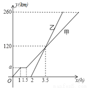 甲、乙两车从A地驶向B地,甲车比乙车早行驶2h,并且在途中休息了0.5h,休息前后速度相同,如图是甲乙两车行驶的距离y(km)与时间x(h)的函数图象.