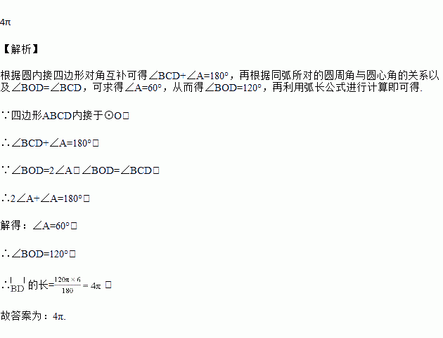 如图,⊙O的半径为6,四边形ABCD内接于⊙O,连接OB,OD,若∠BOD=∠BCD,则弧BD的长为________.