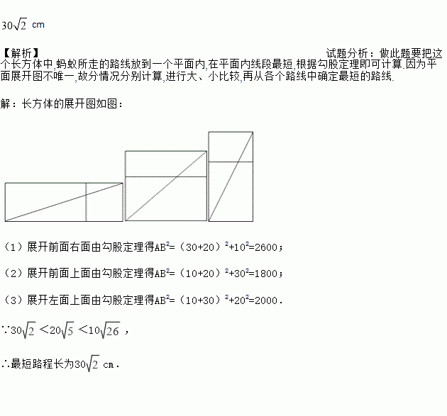 已知长方体的长、宽、高分别为30cm、20cm、10cm,一只蚂蚁从A处出发到B处觅食,求它所走的最短路径.(结果保留根号)