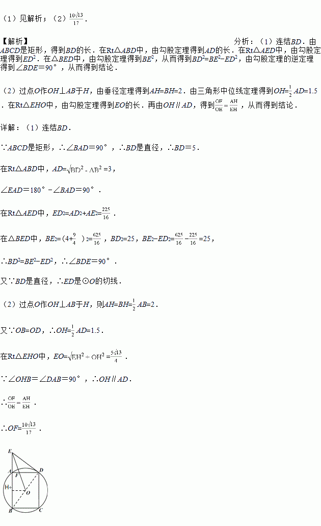 如图,矩形ABCD接于半径为2.5的⊙O,AB=4, 延长BA到E,使AE=,连接ED.