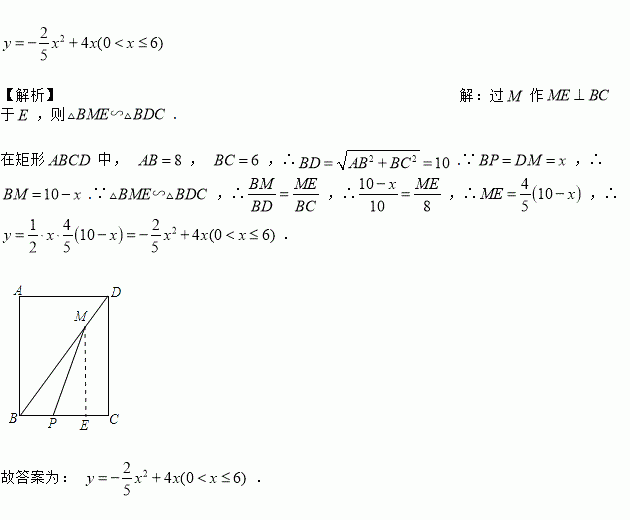 如图,矩形中, , , 是线段上一点,( 不与重合),是上一点,且BP=DM,设, 的面积为,则与之间的函数关系式为__________.