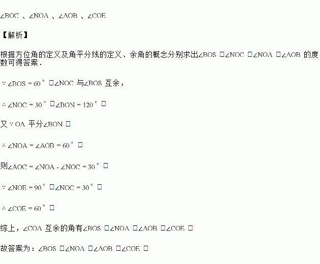 如图,直线SN与直线WE相交于点O,射线ON表示正北方向,射线OE表示正东方向,已知射线OB的方向是南偏东,射线OC在内,且与互余,射线OA平分,图中与互余的角是______.