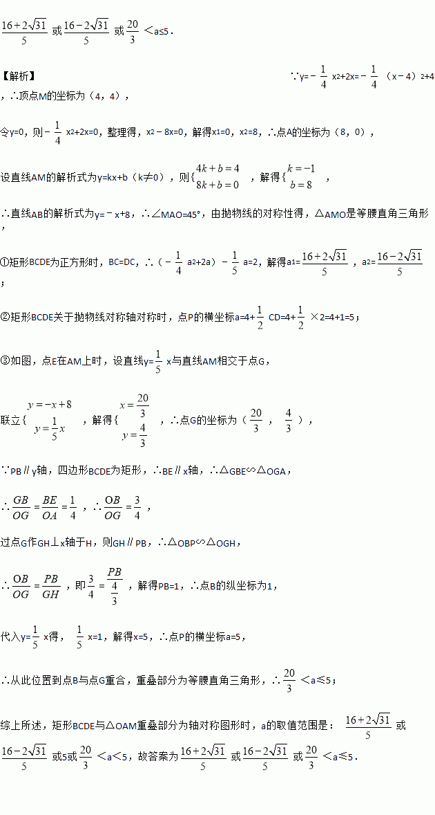 x于点B,交抛物线于点C,以BC为一边,在BC的右侧作矩形BCDE,若CD=2,则当矩形BCDE与△OAM重叠部分为轴对称图形时,a的取值范围是__.