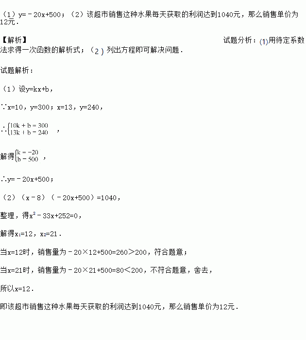 (2)该超市销售这种水果每天获取的利润达到1040元,那么销售单价为多少元?