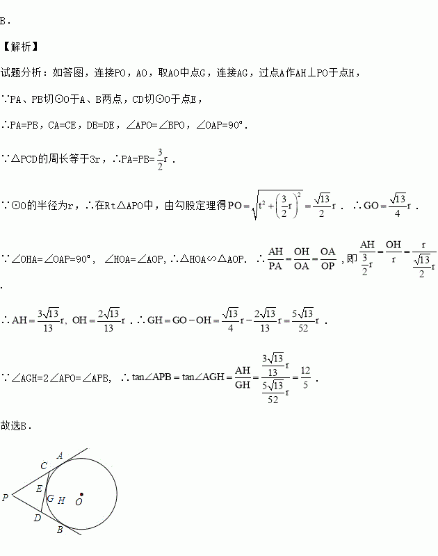 如图,PA、PB切⊙O于A、B两点,CD切⊙O于点E,交PA,PB于C、D,若⊙O的半径为r,△PCD的周长等于3r,则tan∠APB的值是( )