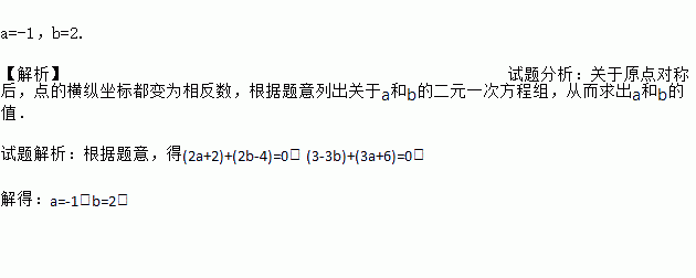 a=-1,b=2. 【解析】试题分析:关于原点对称后,点的横纵坐标都变为相反数,根据题意列出关于a和b的二元一次方程组,从而求出a和b的值. 试题解析:根据题意,得(2a+2)+(2b-4)=0, (3-3b)+(3a+6)=0, 解得:a=-1,b=2.