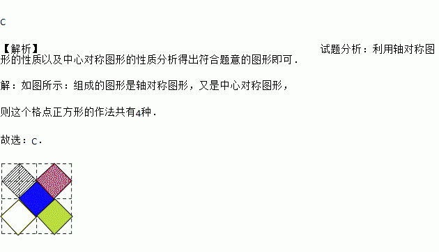 C ¡¾½âÎö¡¿ÊÔÌâ·ÖÎö£ºÀûÓÃÖá¶Ô³ÆÍ¼ÐεÄÐÔÖÊÒÔ¼°ÖÐÐĶԳÆÍ¼ÐεÄÐÔÖÊ·ÖÎöµÃ³ö·ûºÏÌâÒâµÄͼÐμ´¿É£® ¡¾½âÎö¡¿ ÈçͼËùʾ£º×é³ÉµÄͼÐÎÊÇÖá¶Ô³ÆÍ¼ÐΣ¬ÓÖÊÇÖÐÐĶԳÆÍ¼ÐΣ¬ ÔòÕâ¸ö¸ñµãÕý·½ÐεÄ×÷·¨¹²ÓÐ4ÖÖ£® ¹ÊÑ¡£ºC£®