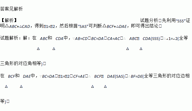 如图,已知AB=CD,BC=DA,E,F是AC上的两点,且AE=CF.试说明:BF=DE.