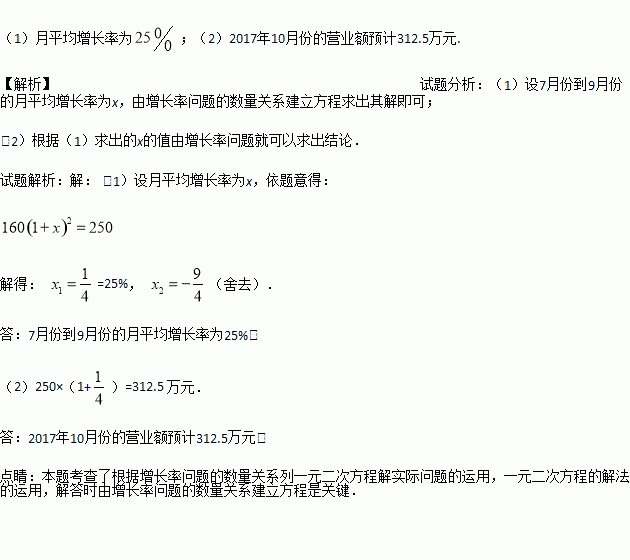 某商场2017年7月份的营业额为160万元,9月份的营业额达到250万元,7月份到9月份的月平均增长率相等.