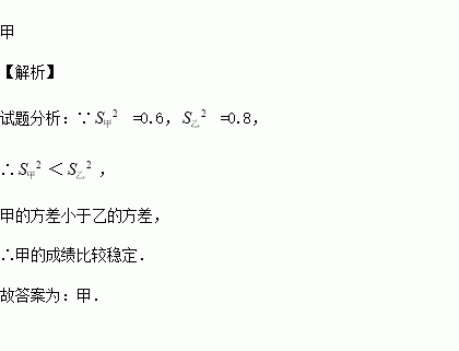 甲、乙两名射击运动员在一次训练中,每人各打10发子弹,根据命中环数求得方差分别是=0.6, =0.8,则运动员 的成绩比较稳定.