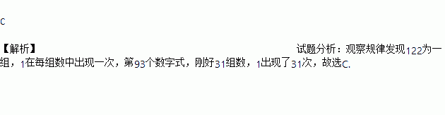 某同学按照某种规律写了下面一串数字:122 122 122 122 122……,当写到第93个数字时,1出现的频数是( )。