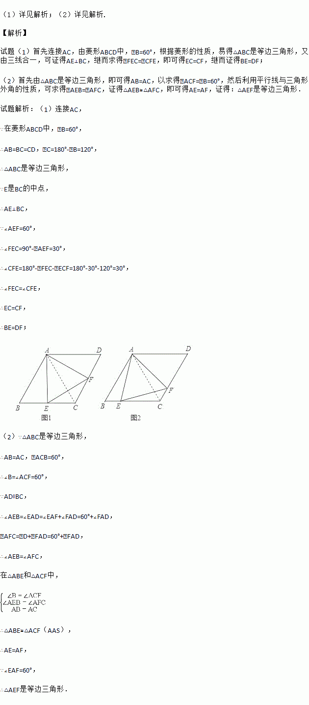 (1)如图①,若点E是BC的中点,∠AEF=60°,求证:BE=DF;