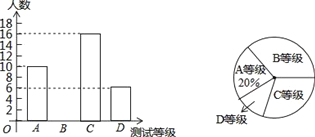 某学校为了解八年级学生的体能状况,从八年级学生中随机抽取部分学生进行八百米跑体能测试,测试结果分为A、B、C、D四个等级,请根据两幅统计图中的信息回答下列问题: