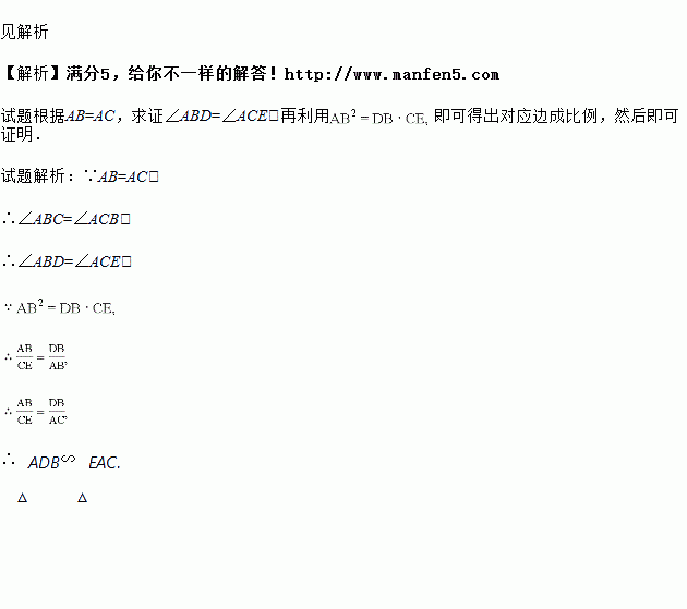 如图,已知在△ABC中,AB=AC,D为 CB延长线上一点,E为 BC延长线上一点,且满足AB2=DB•CE.