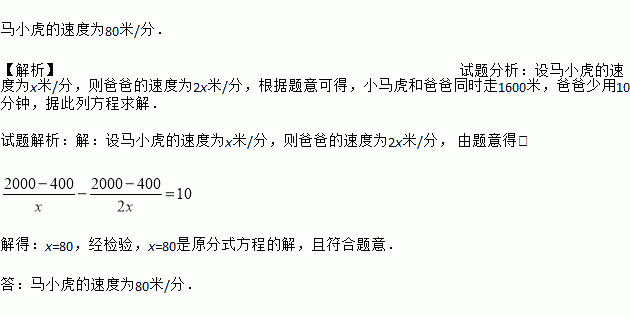 马小虎的速度为80米/分. 【解析】试题分析:设马小虎的速度为x米/分,则爸爸的速度为2x米/分,根据题意可得,小马虎和爸爸同时走1600米,爸爸少用10分钟,据此列方程求解. 试题解析:【解析】 设马小虎的速度为x米/分,则爸爸的速度为2x米/分, 由题意得: 解得:x=80,经检验,x=80是原分式方程的解,且符合题意. 答:马小虎的速度为80米/分.