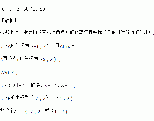 在平面直角坐标系中,点A的坐标为(-3,2),若线段轴,且AB的长为4,则点B的坐标为_________。![]()