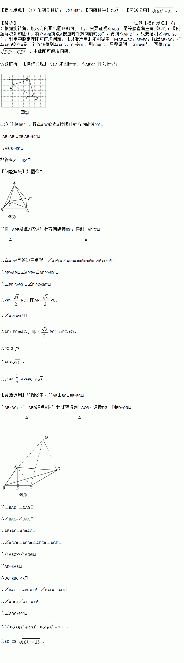 想法一:将△APC绕点A按顺时针方向旋转60°,得到△AP′B,连接PP′,寻找PA,PB,PC三条线段之间的数量关系;