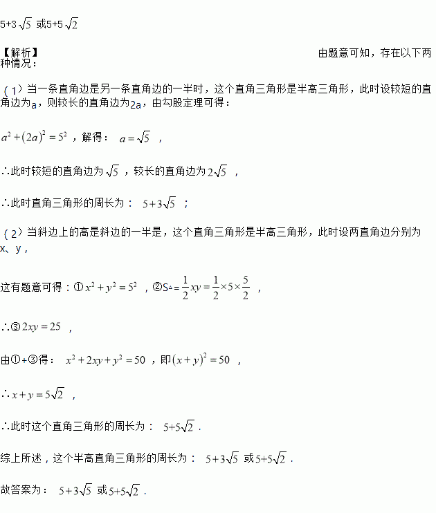 如果一个三角形有一条边上的高等于这条边的一半,那么我们把这个三角形叫做半高三角形.已知直角三角形是半高三角形,且斜边,则它的周长等于_________.