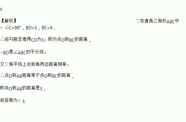 如图,在△ABC中,∠C=90°,BD平分∠ABC,若BD=5,BC=4,则点D到边AB的距离为________.