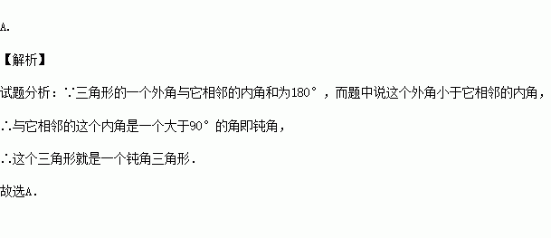 如果三角形的一个外角小于和它相邻的内角,那么这个三角形为( ).
