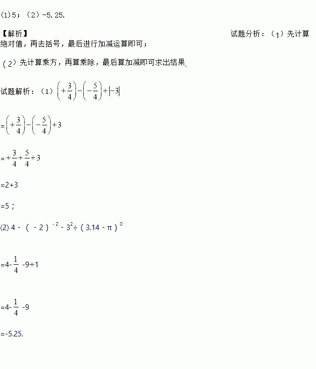 (1); (2) 4﹣(﹣2)﹣2﹣32÷(3.14﹣π)0