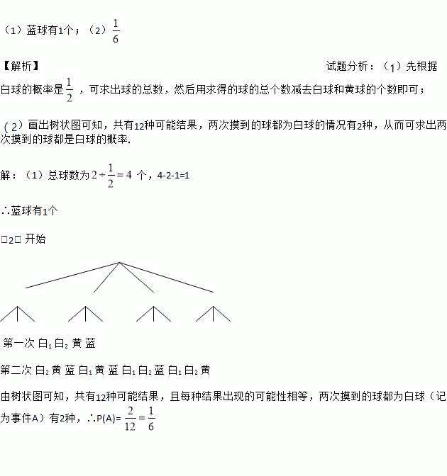 £¨1£©À¶ÇòÓÐ1¸ö£»£¨2£© ¡¾½âÎö¡¿ÊÔÌâ·ÖÎö£º£¨1£©Ïȸù¾Ý°×ÇòµÄ¸ÅÂÊÊÇ£¬¿ÉÇó³öÇòµÄ×ÜÊý£¬È»ºóÓÃÇóµÃµÄÇòµÄ×ܸöÊý¼õÈ¥°×ÇòºÍ»ÆÇòµÄ¸öÊý¼´¿É£» £¨2£©»³öÊ÷״ͼ¿ÉÖª£¬¹²ÓÐ12ÖÖ¿ÉÄܽá¹û£¬Á½´ÎÃþµ½µÄÇò¶¼Îª°×ÇòµÄÇé¿öÓÐ2ÖÖ£¬´Ó¶ø¿ÉÇó³öÁ½´ÎÃþµ½µÄÇò¶¼Êǰ×ÇòµÄ¸ÅÂÊ. ¡¾½âÎö¡¿ £¨1£©×ÜÇòÊýΪ¸ö£¬4-2-1=1 ¡àÀ¶ÇòÓÐ1¸ö £¨2£© ¿ªÊ¼ µÚÒ»´Î °×1 °×2 »Æ À¶ µÚ¶þ...