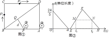 (3)如图②,点M、N分别在线段EF、GH上,线段MN平行于横轴,M、N的横坐标分别为t1、t2.设机器人用了t1(s)到达点P1处,用了t2(s)到达点P2处(见图①).若CP1+CP2=7,求t1、t2的值.
