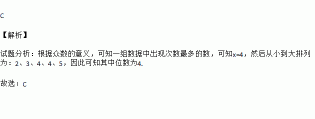 C 【解析】 试题分析:根据众数的意义,可知一组数据中出现次数最多的数,可知x=4,然后从小到大排列为:2、3、4、4、5,因此可知其中位数为4. 故选:C