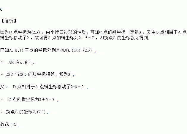 在平面直角坐标系中,平行四边形ABCD的顶点A,B,D的坐标分别是(0,0),(5,0),(2,3),则顶点C的坐标是( )