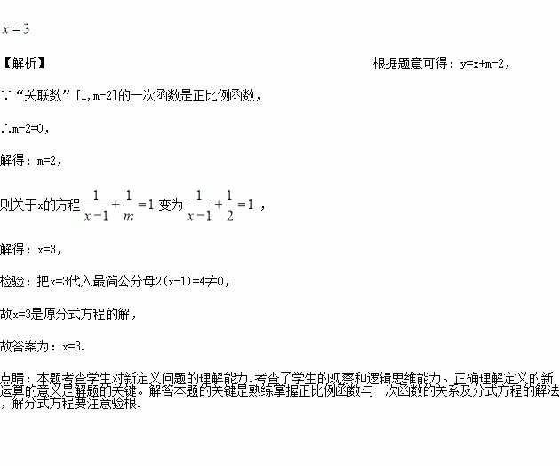 新定义: 为一次函数y=ax+b(a≠0,a,b为实数)的“关联数”.若“关联数”为的一次函数是正比例函数,则关于x的方程的解为____.