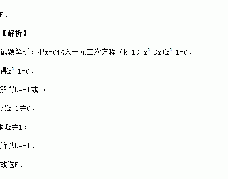 已知关于x的一元二次方程(k-1)x2+3x+k2-1=0有一根为0,则k=( )