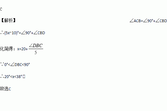 如图,直角△ADB中,∠D=90°,C为AD上一点,且∠ACB的度数为(5x-10)°,则x的值可能是( )
