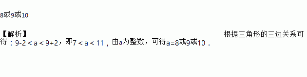 若三角形的三边长分别为2,a,9,且a为整数,则a的值为________.