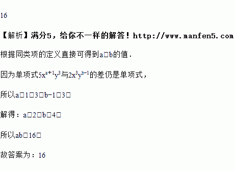 如果单项式5xa+1y3与2x3yb﹣1的差仍是单项式,那么ab=_____.