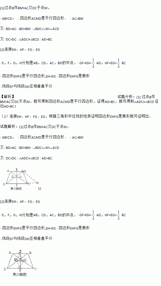 (本小题满分9分)如图,四边形ABCD中AB∥CD,AB≠CD,BD=AC。