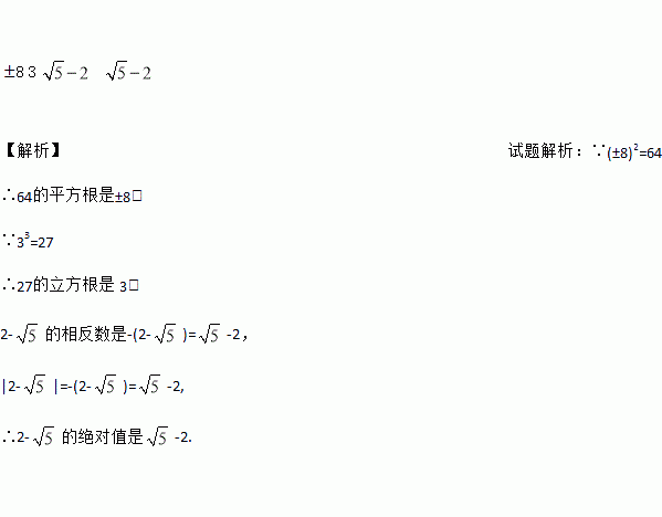 64的平方根是_____,27的立方根是_____;2﹣的相反数是_____,绝对值是_____.