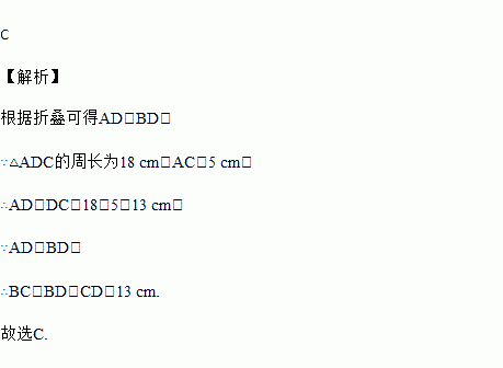 如图所示,将△ABC沿直线DE折叠后,使得点B与点A重合.已知AC=5 cm,△ADC的周长为18 cm,则BC的长为( )