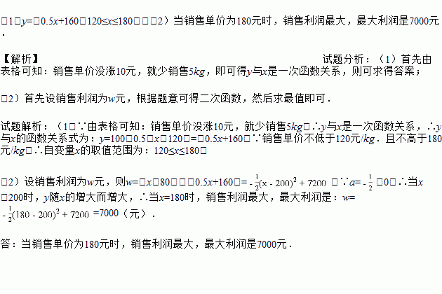 (2016湖北省十堰市)一茶叶专卖店经销某种品牌的茶叶,该茶叶的成本价是80元/kg,销售单价不低于120元/kg.且不高于180元/kg,经销一段时间后得到如下数据: