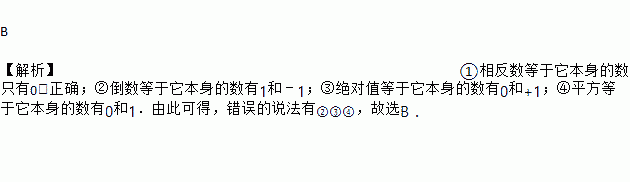 B 【解析】①相反数等于它本身的数只有0,正确;②倒数等于它本身的数有1和﹣1;③绝对值等于它本身的数有0和+1;④平方等于它本身的数有0和1.由此可得,错误的说法有②③④,故选B.