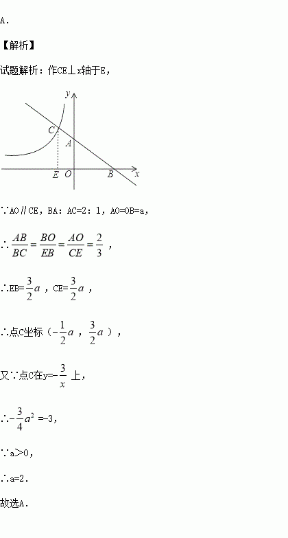 如图,平面直角坐标系中,直线y=-x+a与x、y轴的正半轴分别交于点B和点A,与反比例函数y=-的图象交于点C,若BA:AC=2:1,则a的值为( )