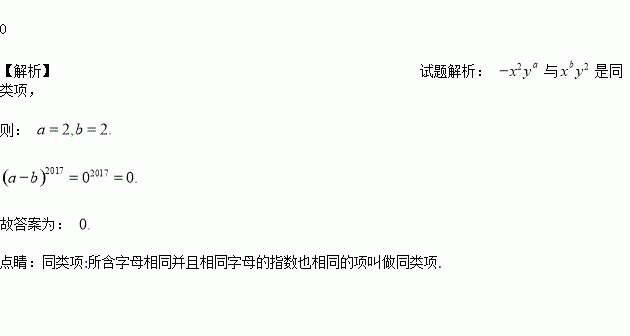 若﹣x2ya与xby2是同类项,则(a﹣b)2017=_____.