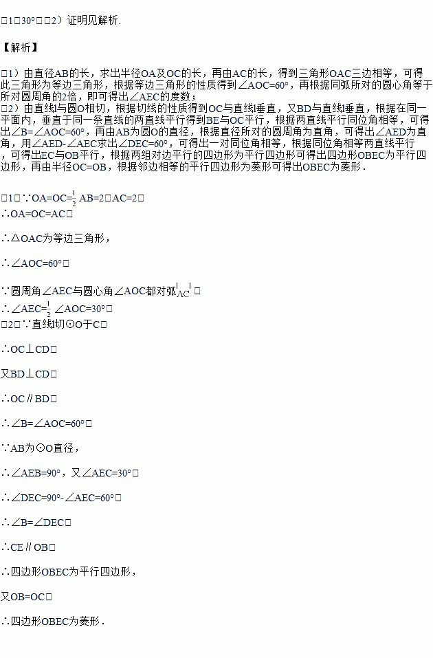 如图,⊙O的直径AB=4,C为圆周上一点,AC=2,过点C作⊙O的切线l,过点B作l的垂线BD,垂足为D,BD与⊙O交于点 E.