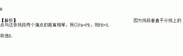 B 【解析】因为线段垂直平分线上的点与这条线段两个端点的距离相等,所以PA=PB,则PB=5. 故选B.